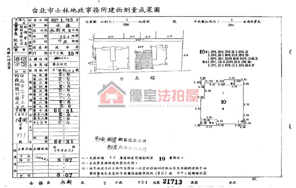 (一)據債務人108.5.21陳報之租約及公證書:21713建號現為第三人曾楙棠承租,租期自107.9.1 起至113.8.31止租金每月2萬元,而該租賃關係業經本院以執行命令終止,故拍定後點交, 惟第三人現異議(抗告)中,如經廢棄裁定確定,不能除租時,則改為不點交,請應買人自行 查明注意。其餘標的係拍賣不動產應有部分,拍定後不點交。 (二)民國107年12月10日現場查封時發現,社區管理員在場陳稱,管理費每月新台幣3,242元,自 民國106年11月開始未繳納,有機械式停車位,但不知車位編號及位置等語;624-1地號位於 社子街22巷60弄3號房屋旁邊,為道路用地。 (三)據第三人金賞大廈管理委員會民國108年2月13日函記載,所有權人林郁珽(臺北市士林區中 正路672號10樓)有停車位,編號B2-6號,依所有權人權狀為主;所有權人林郁珽至108年2 月13日止,積欠管理費新台幣48,800元。 (四)惟現在實際情形如何,請應買人自行查明注意。 (五)是否確有停車位使用權及共有人間之分管契約為何均不明,請應買人自行查明。如有爭議, 以實體確定判決為準。 (六)624-1土地使用分區為第三之二種住宅區。惟投標時之土地使用分區是否有變更,仍請投標 人投標前自行查明注意。